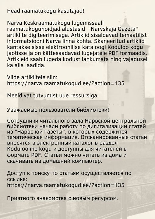 Kultusajakiri Eesti Naine avab koostöös Narva keskraamatukoguga näituse „Eesti Naise sajand". 1924. aastal ellu kutsutud legendaarne väljaanne suudab endiselt üllatada. Põnev väljapanek lubab kiigata Eesti Naise kirjusse ajalukku ja tutvustab toredaid leide toimetuse kappidest.
