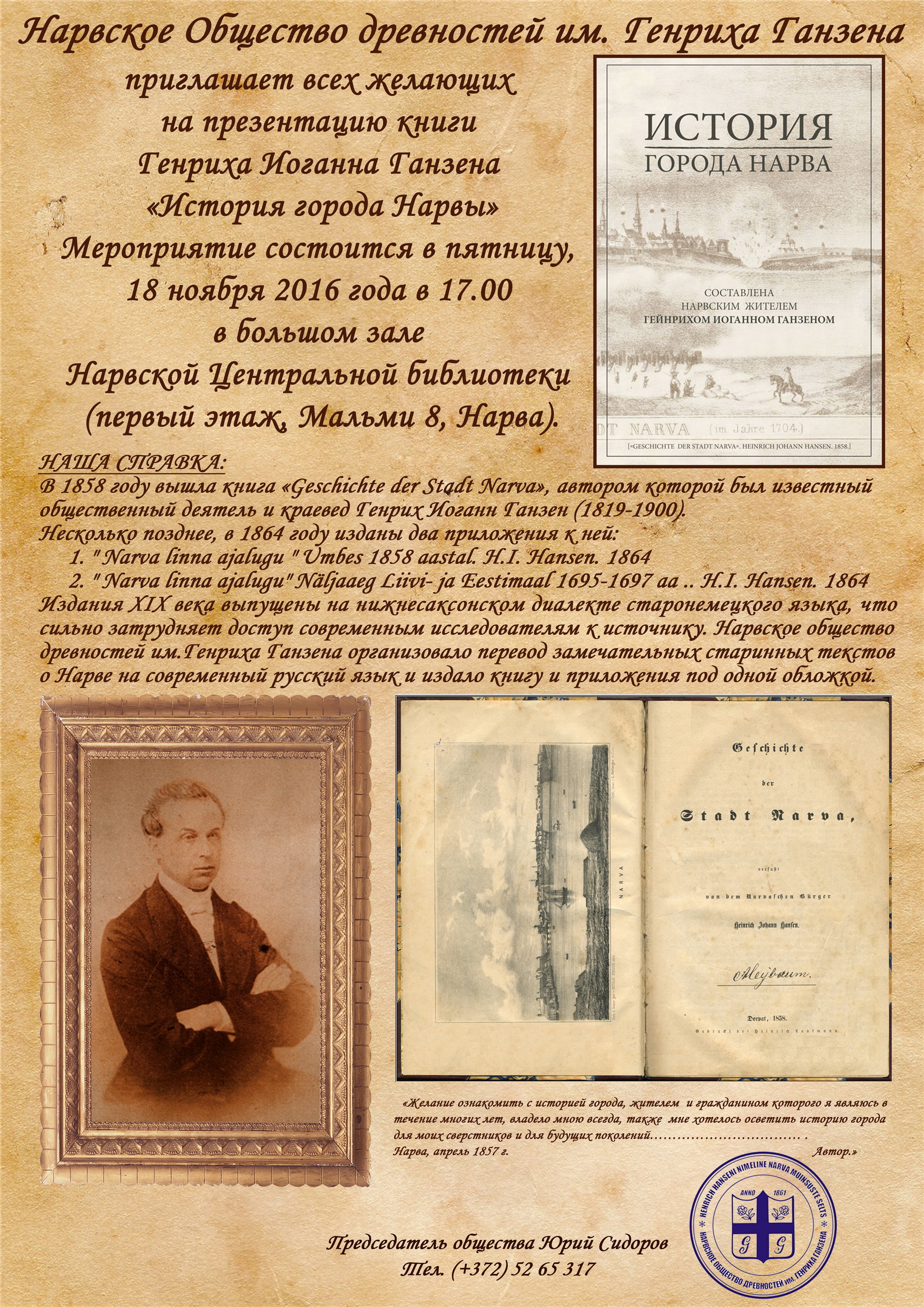 Narva Keskraamatukogu kutsub kõiki ajaloohuvilisi reedel, 18. novembril, kell 17.00 Henrich Johann Hanseni raamatu „Geschichte der Stadt Narva“ venekeelse trüki tutvustusele.