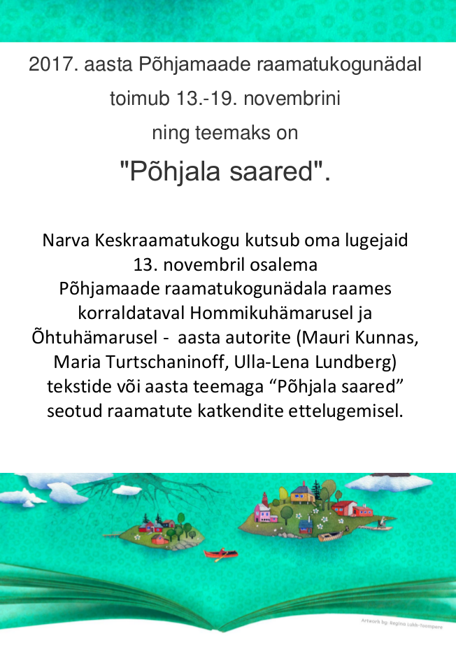 Narva Keskraamatukogu kutsub oma lugejaid 13. novembril osalema Põhjamaade raamatukogunädala raames korraldataval Hommikuhämarusel ja Õhtuhämarusel - aasta autorite (Mauri Kunnas, Maria Turtschaninoff, Ulla-Lena Lundberg) tekstide või aasta teemaga “Põhjala saared” seotud raamatute katkendite ettelugemisel.