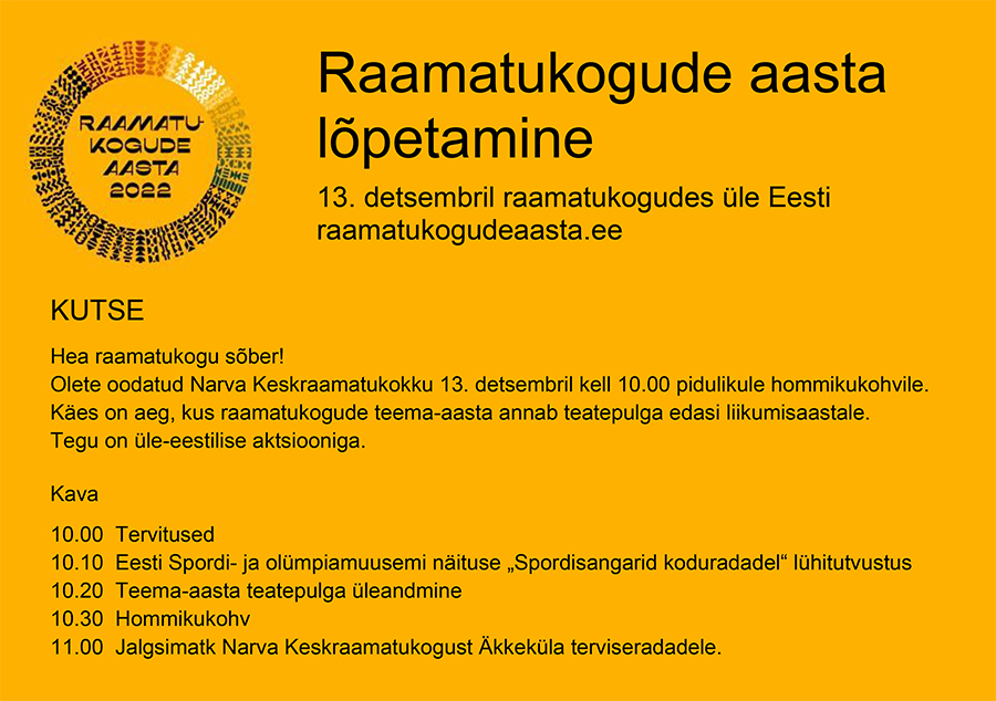 13. detsembril kell 10.00 annab Narva Keskraamatukogu lõppeva raamatukogude teema-aasta puhul edasi teatepulga liikumisaastale. Tegu on üle-eestilise aktsiooniga.