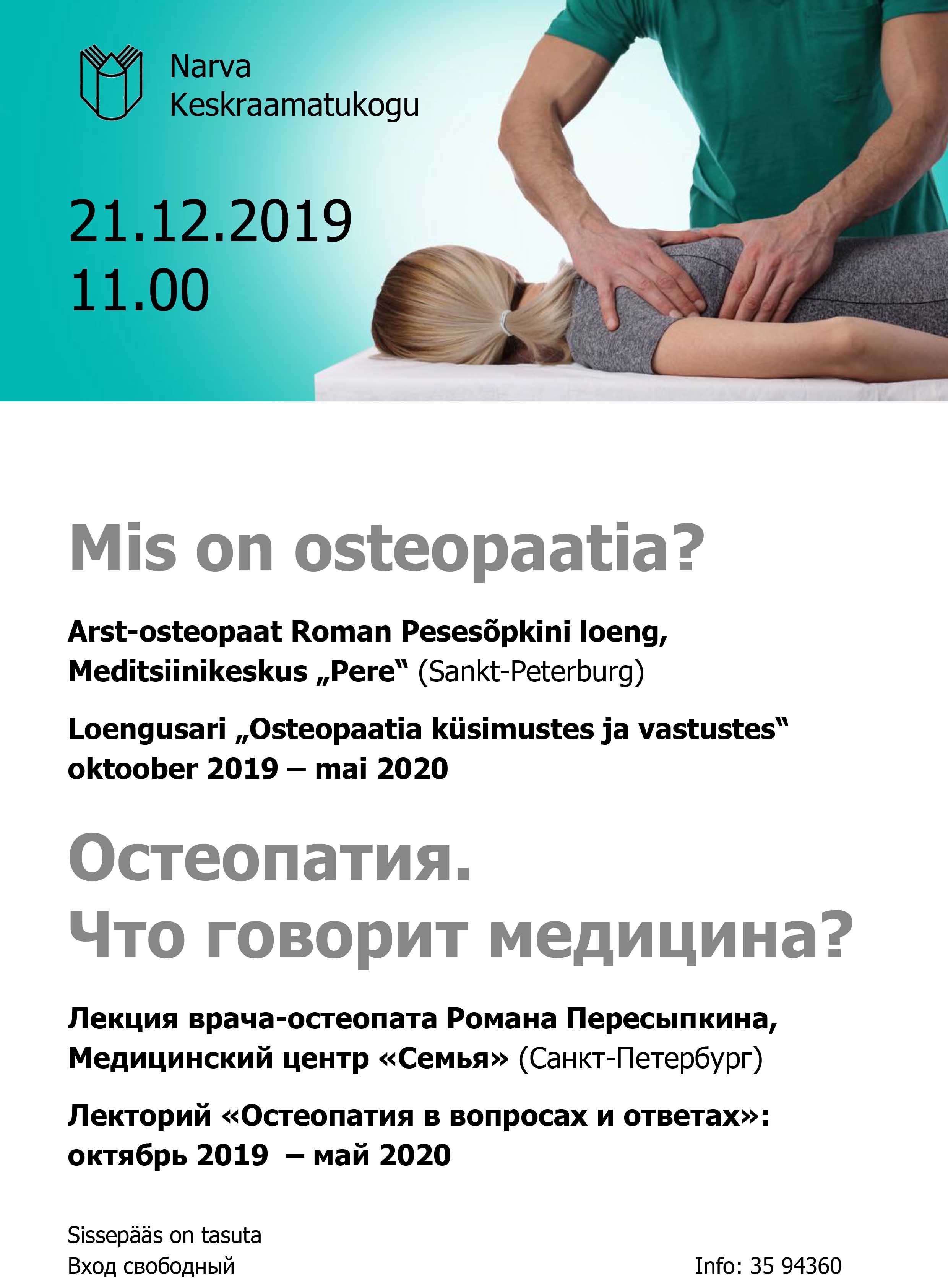 Narva Keskraamatukogu kutsub kõiki huvilisi loengusarjale „Osteopaatia küsimustes ja vastustes“, mis toimub 1 kord kuus laupäeviti oktoobrist 2019 kuni maini 2020.