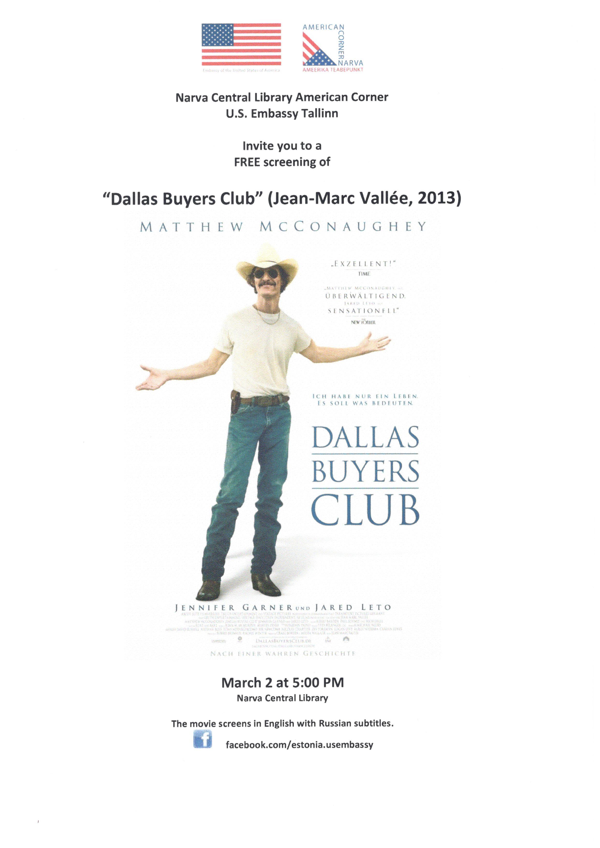 “Dallas Buyers Club” directed by Jean-Marc Vallée (2013, 117 minutes). Monday, March 2, at 5:00 PM at Narva Central Library (Malmi 8).