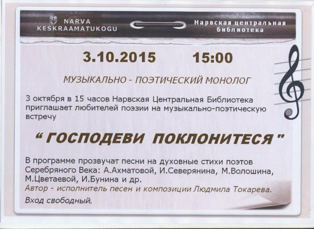 Концерт автора-исполнителя Людмилы Токаревой.Состоится на 1 этаже Нарвской центральной библиотеки 3 октября 2015 в 15 часов.