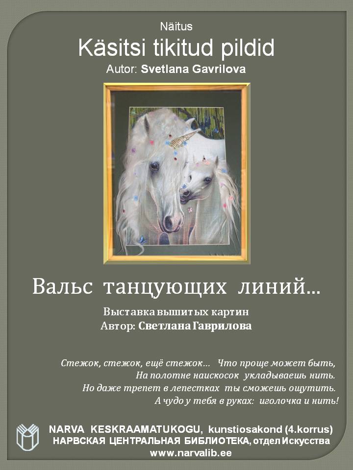 ВАЛЬС ТАНЦУЮЩИХ ЛИНИЙ... Выставка вышитых картин в Нарвской центральной библиотеке, отдел Искусства. Автор: Светлана Гаврилова.