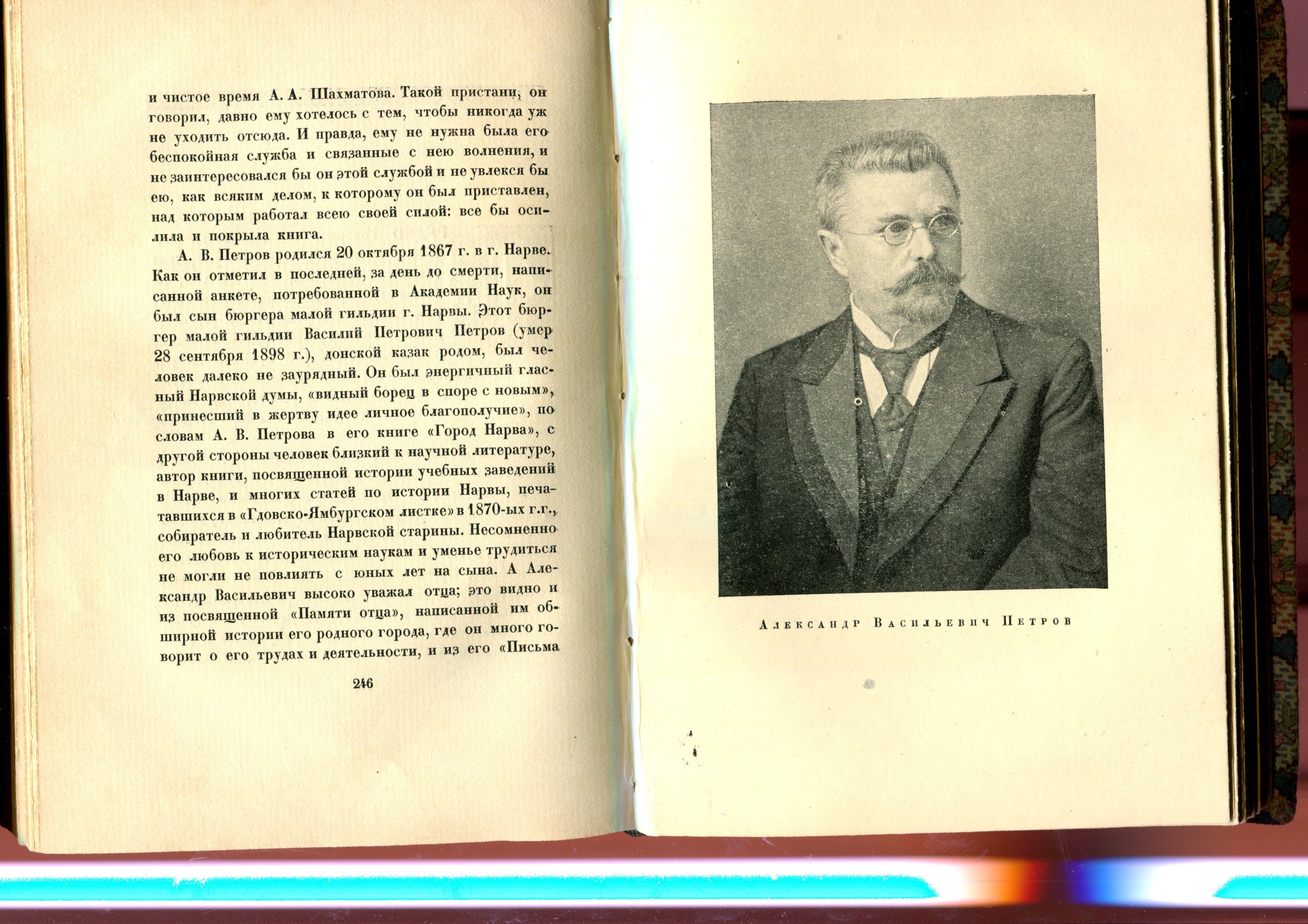 Впервые портрет Александра Петрова я увидела около 15 лет назад, просматривая газету «Нарвский листок». Мне попался в руки юбилейный выпуск газеты, посвященный ее десятилетию. Но сведения о нем были очень скудны. Зная, что он многие годы работал в библиотеке Академии наук, мы сделали запрос в Российскую национальную библиотеку. Благодаря сотруднику библиотеки С.Степанову, мы узнали об Александре Петрове очень много интересного. В 1929 году его коллегой В.И.Срезневским была написана статья «Памяти А.В.Петрова», с приложением его портрета, которая была опубликована в «Альманахе библиофила».