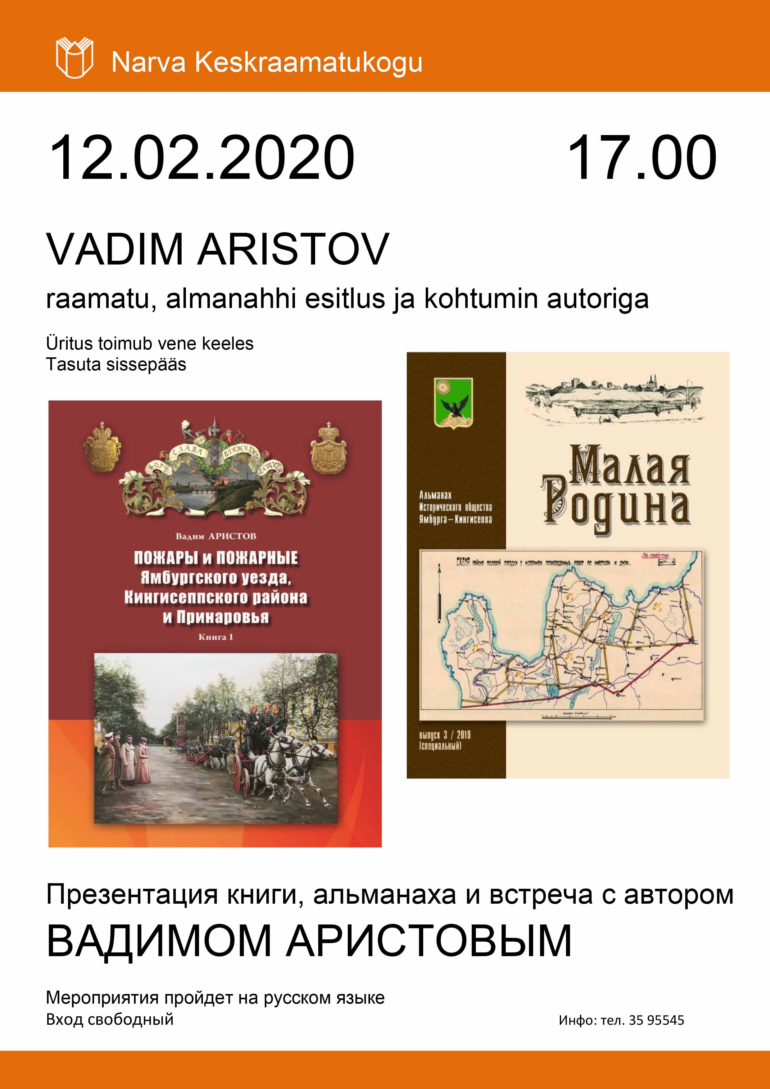 12 февраля 2020 года 17.00 в Нарвской библиотеке состоится презентация сразу двух книг: новой книги историка и писателя Вадима Аристова «Пожары и пожарные Ямбургского уезда, Кингисеппского района и Принаровья» и нового выпуска альманаха Исторического общества Ямбурга – Кингисеппа «Малая Родина».
