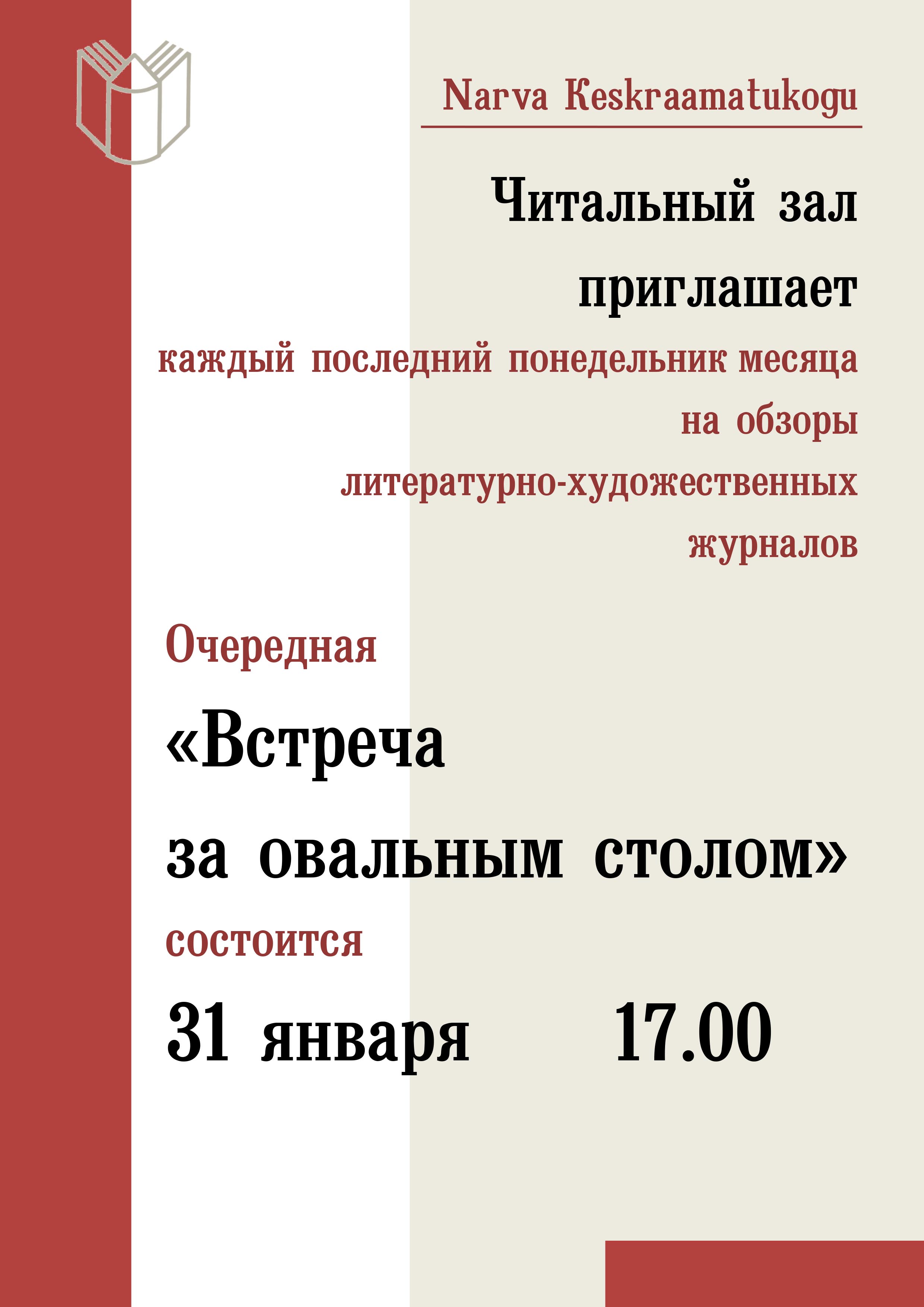 28 января 2019 в 17.00 в читальном зале состоится очередная «Встреча за овальным столом», на которой будут представлены произведения, напечатанные в ноябрьских и декабрьских номерах литературно-художественных журналов 2018 года.