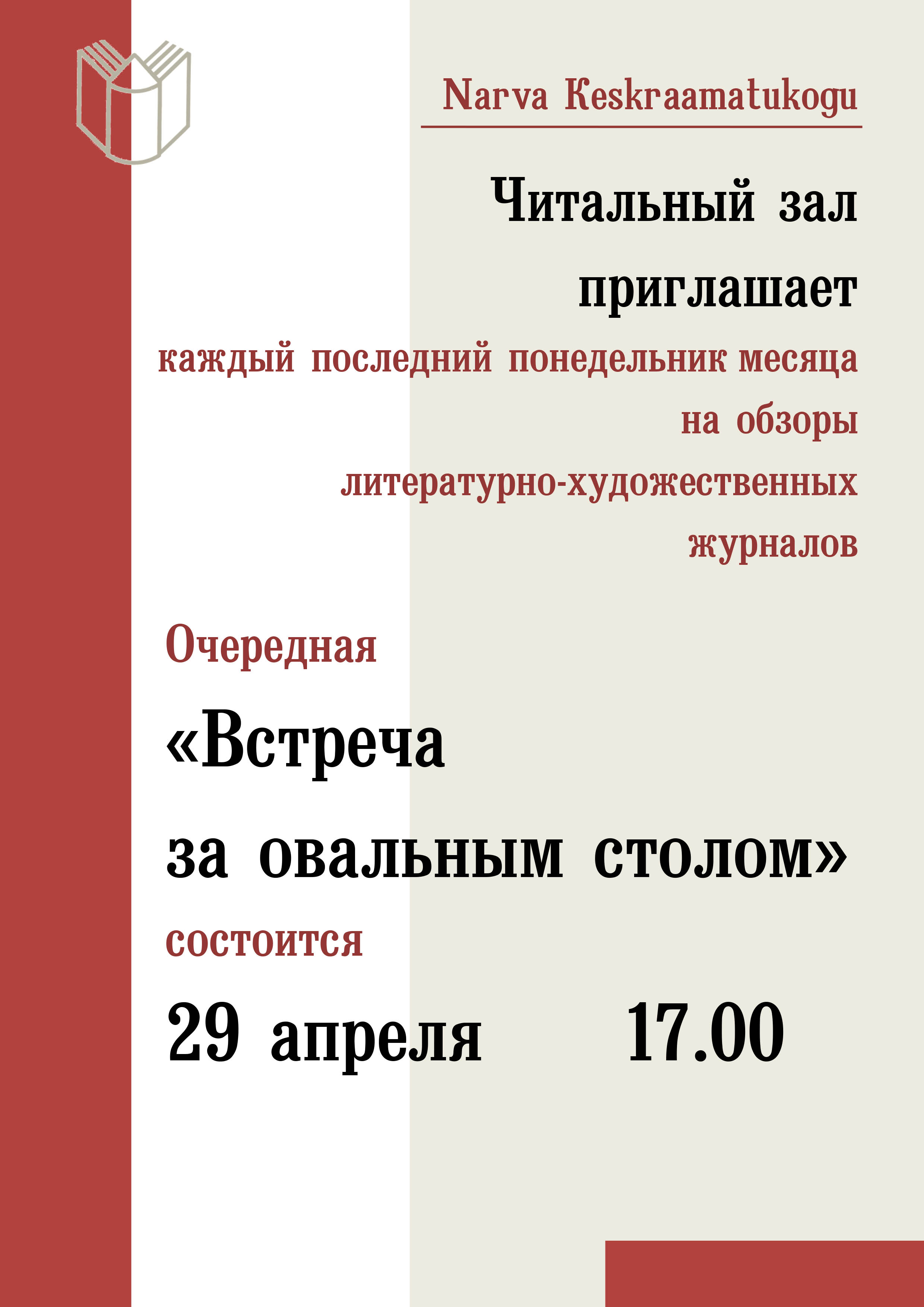 29 aпреля 2019 в 17.00 в читальном зале состоится очередная «Встреча за овальным столом», на которой будут представлены произведения, напечатанные в мартовских номерах литературно-художественных журналов 2019 года.
