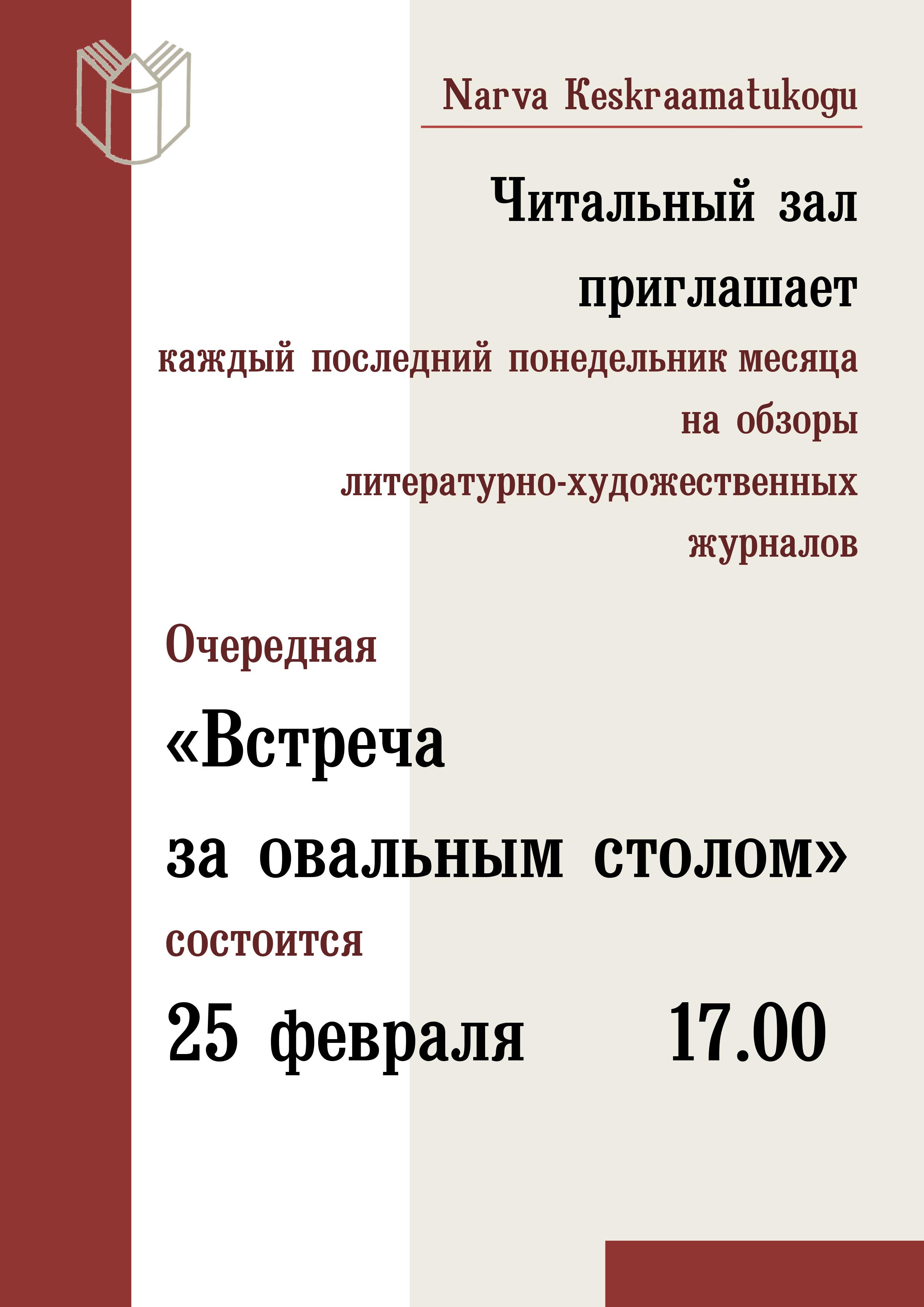 25 февраля 2019 в 17.00 в читальном зале состоится очередная «Встреча за овальным столом», на которой будут представлены произведения, напечатанные в первых номерах литературно-художественных журналов 2019 года.