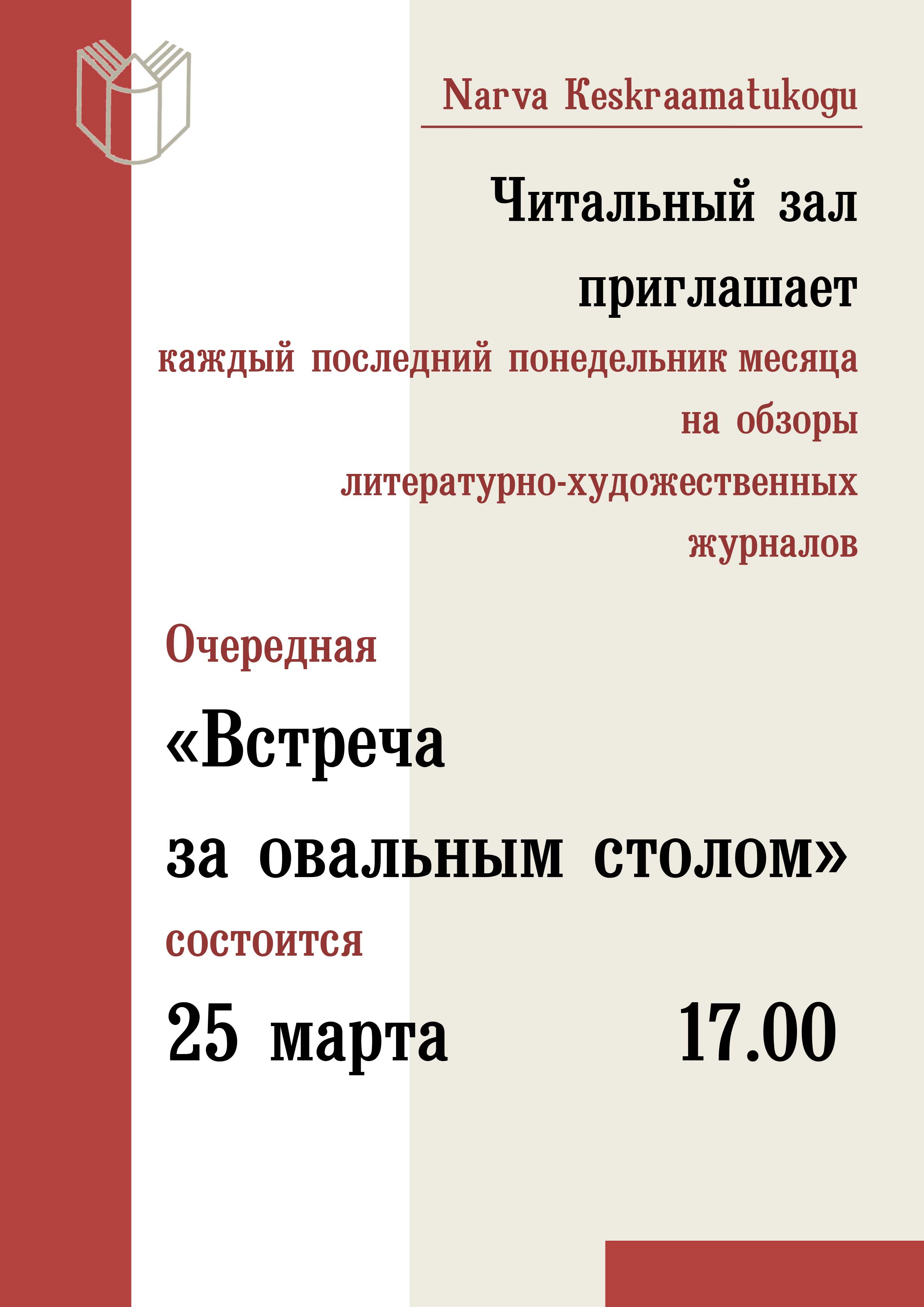 25 марта 2019 в 17.00 в читальном зале состоится очередная «Встреча за овальным столом», на которой будут представлены произведения, напечатанные в февральских номерах литературно-художественных журналов 2019 года.
