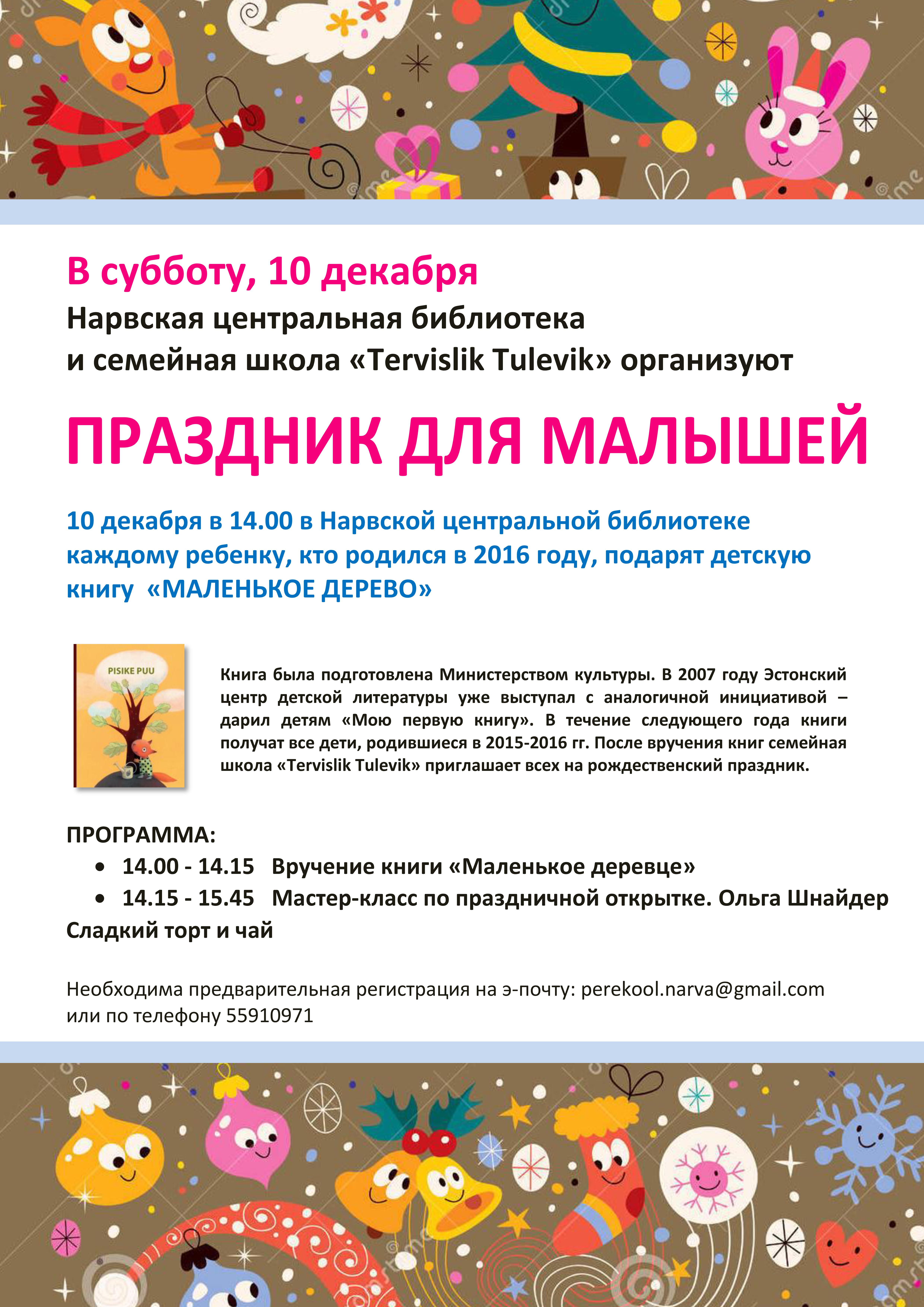 10 декабря в 14.00 Нарвская центральная библиотека и семейная школа "Tervislik Tulevik" приглашают малышей на праздник, где каждому ребенку, кто родился в 2016 г., подарят книгу "Маленькое дерево"