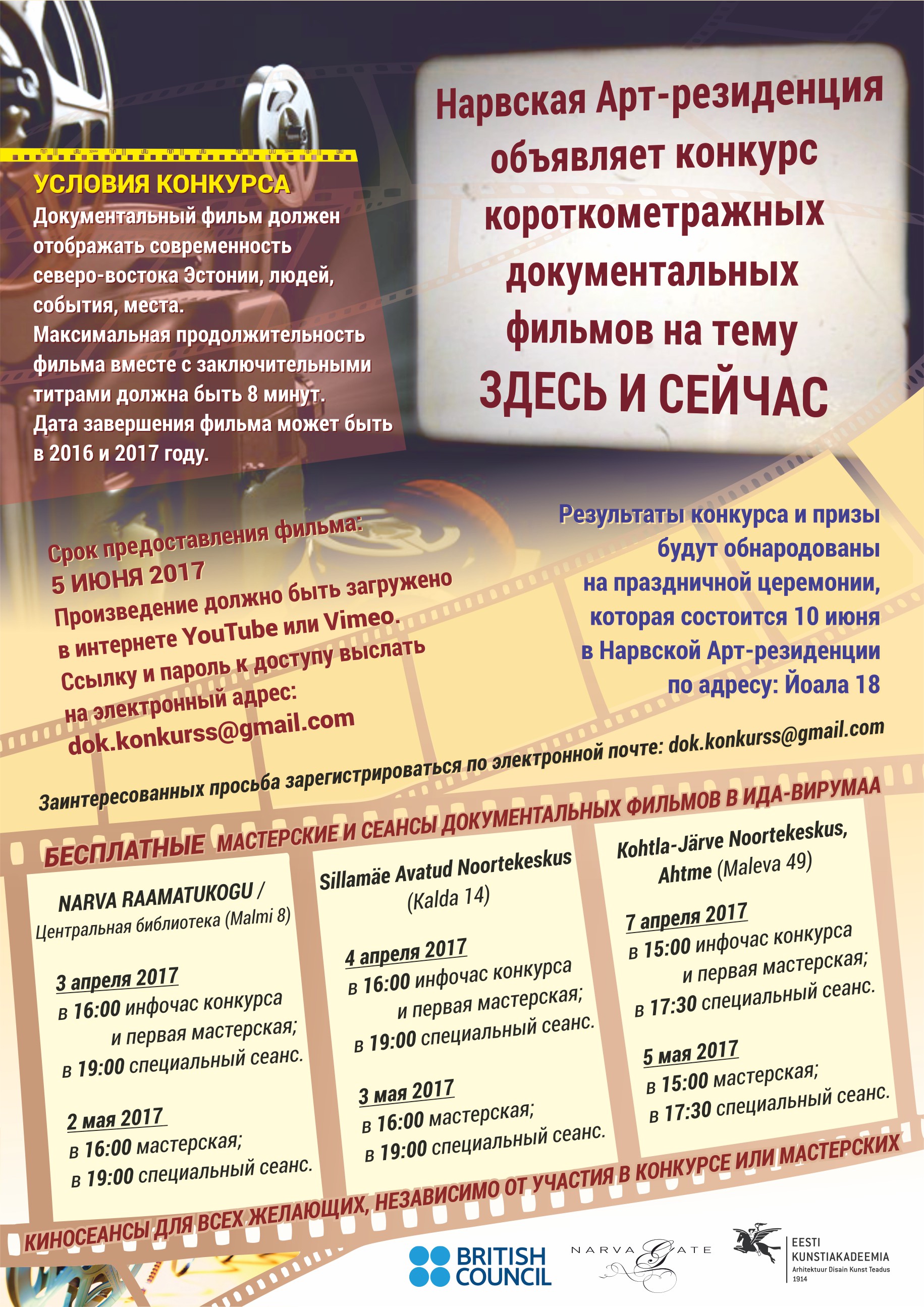 - 7 aprill 2017 в 15:00 инфочас конкурса и первая мастерская; в 17:30 специальный сеанс.