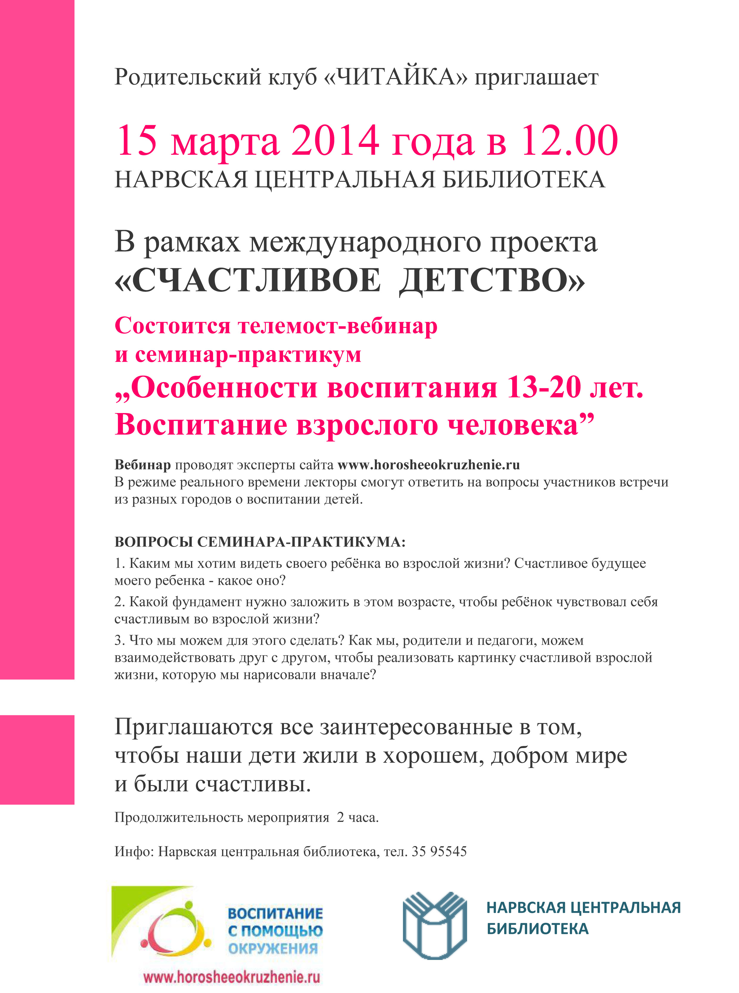 15 марта 2014 года в 12.00 в Нарвской Центральной библиотеке.В рамках международного проекта «СЧАСТЛИВОЕ ДЕТСТВО». Состоится телемост-вебинар и семинар–практикум «Особенности воспитания 13 – 20 лет. Воспитание взрослого человека»