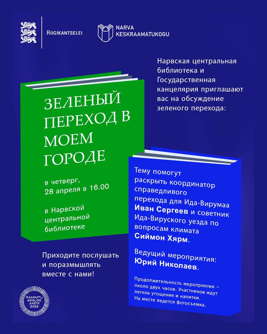 В четверг, 28 апреля в 16.00 Нарвская центральная библиотека и Государственная канцелярия приглашают вас на обсуждение зеленого перехода.
